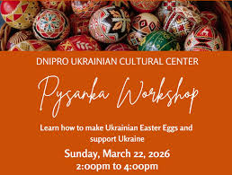Ukrainian Easter Egg Workshop- March 22, 2026 from 2pm to 4pm at Dnipro Ukrainian Cultural Center, 562 Genesee Street, Buffalo. Tickets are $44.52 and includes all supplies.