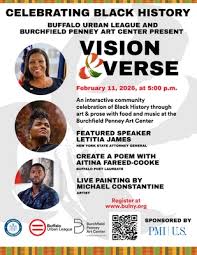 FREE-Vision and Verse at Burchfield Penny Art Center- Letita James, Aitina Faqreed- Cooke and Michael Constantine– February 11, 2026 at 5pm celebrating Black History Month through art, poetry, music and food. FREE but register.