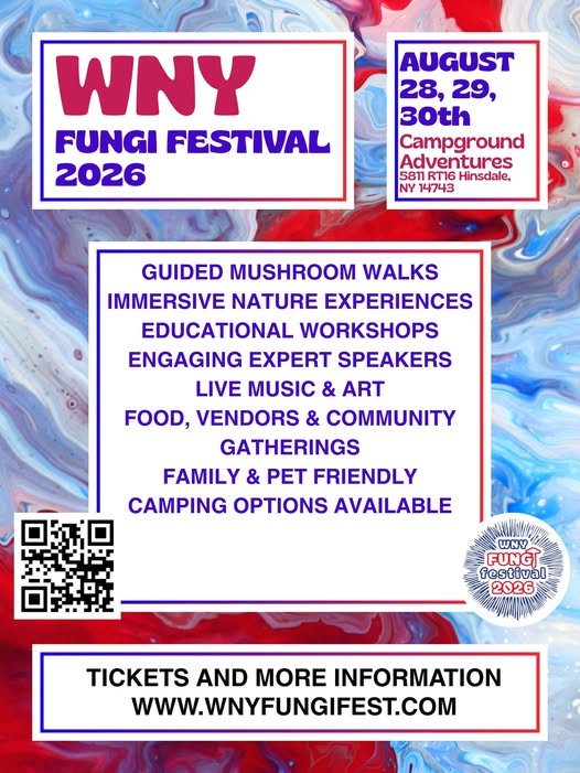 WNY Fungi Festival– August 28 to 30, 2026 at Campground Adventures, 5811 Route 16, Hinsdale. Tickets are $77. Keynote Speaker is Dennis Walker. Music by Patrick Jaquen Band.