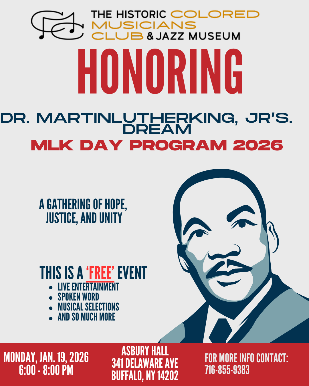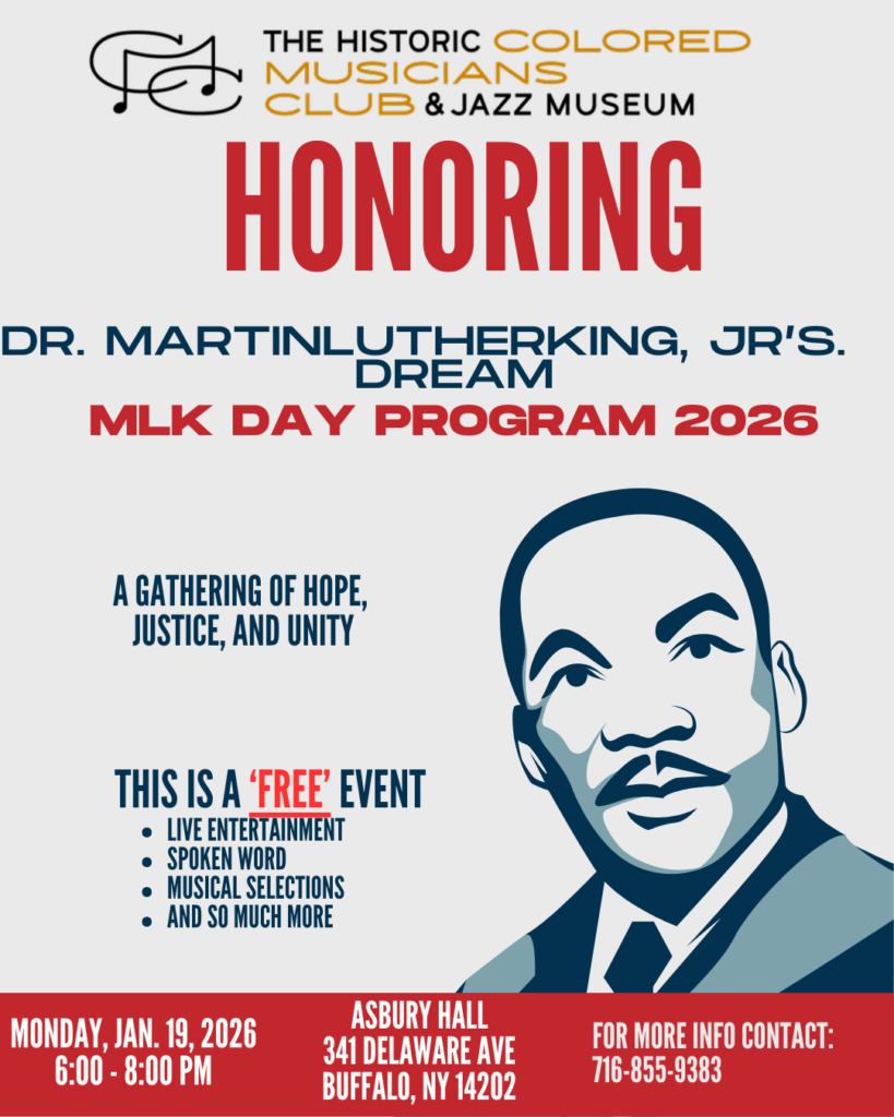 Postponed due to weather. FREE-Colored Musicians Club Martin Luther King Jr Day as Asbury Hall– January 19, 2026 from 6pm to 8pm at 341 Delaware Are. Features live entertainment, and spoken words. FREE- GET Tickets.