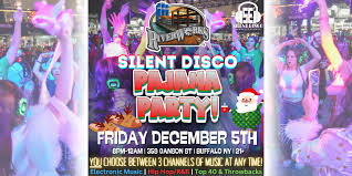 Silent Disco Pajama Party at Riverworks– December 5, 2025 from 8pm to Midnight. Tickets are $23.18. 21+You can dance in your COZIEST pajamas while choosing from three exciting channels of music.
