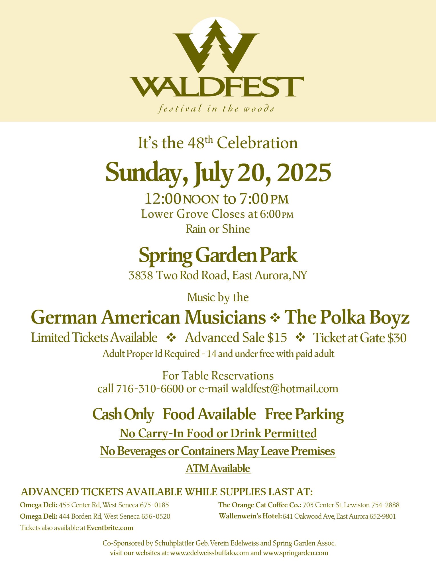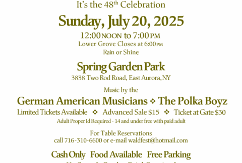 Waldfest at Spring Garden – July 20, 2025 from Noon to 7pm at 3838 Two Rod Road, Marilla, NY. Features German American Musicians and the Polka Boys. Advanced tickets are $15 and at the door- $30. Call 310-6600 for reservations.