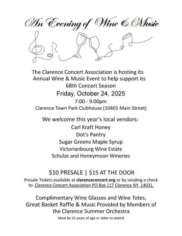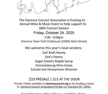 Wine and Music Concert at Clarence Town Park Club House– October 24, 2025 at 7:30pm with tickets at $10 pre-sale and $15 at the door.